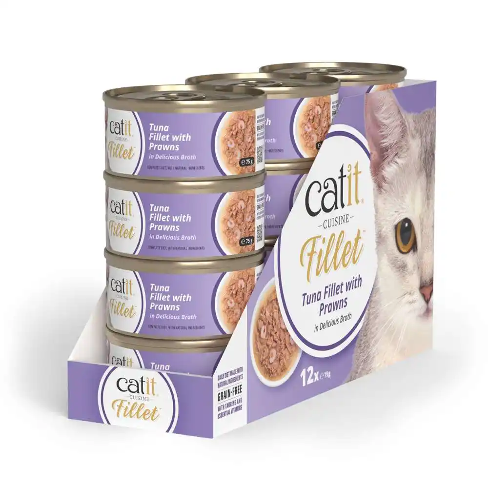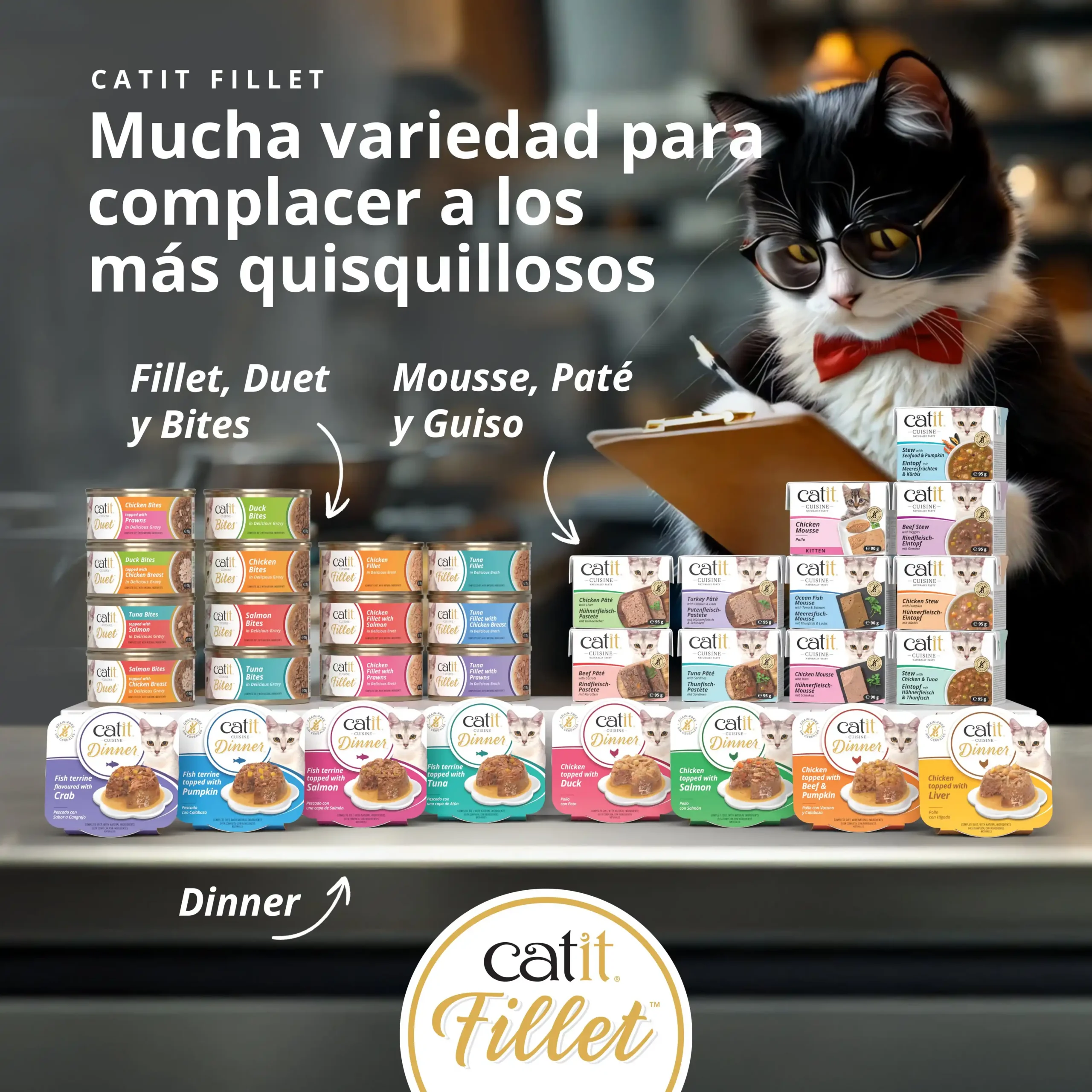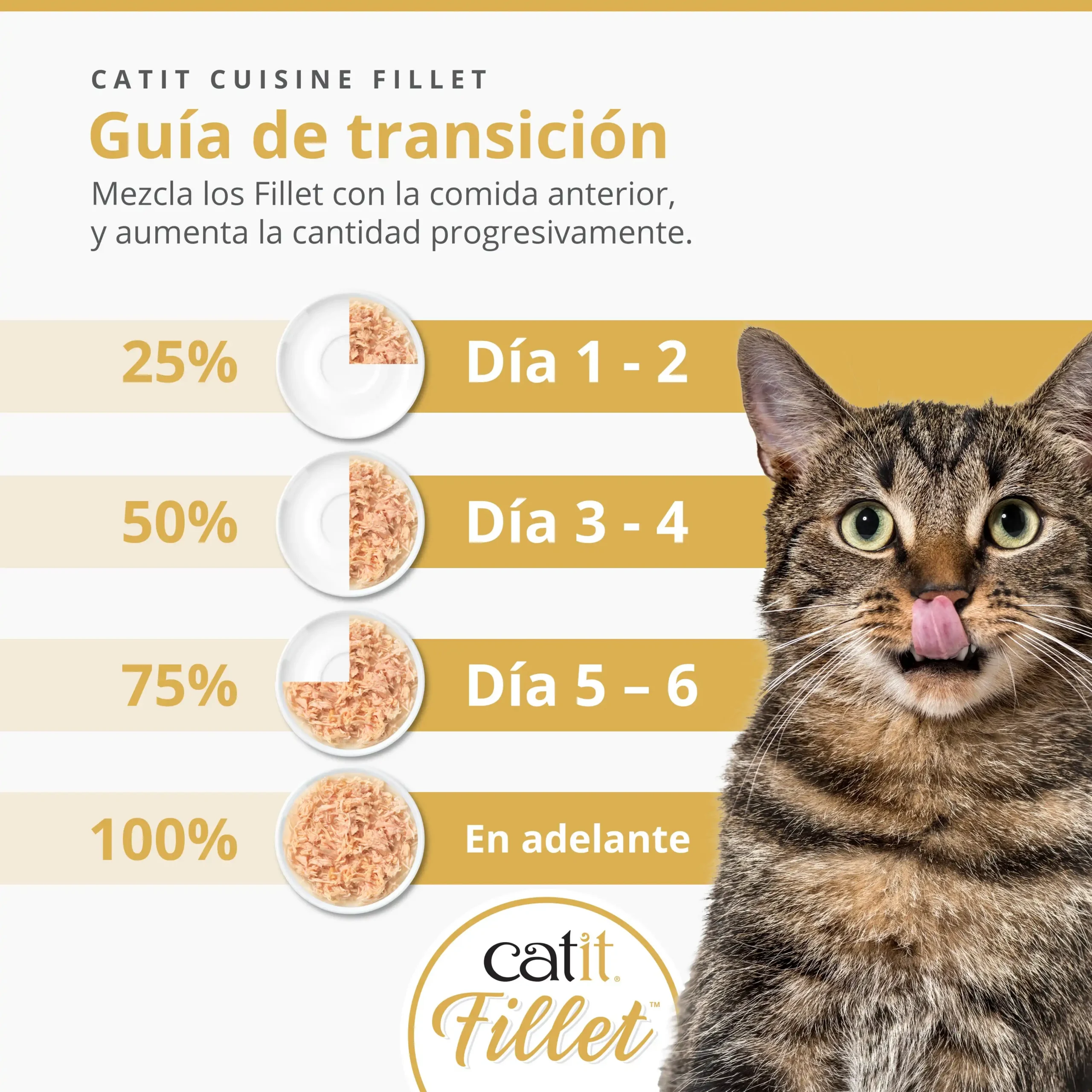 Tierno atún desmenuzado de primera calidad en un sabroso caldo. — Catit Cuisine Fillet es una dieta diaria alta en proteínas y sin cereales, diseñada para deleitar incluso a los felinos más exigentes. Elaborado con tiras de atún de primera calidad y servido en un caldo rico y sabroso, cada bocado proporciona la hidratación y el sabor que le encantará a tu gato. Con una lista de ingredientes limpia y sencilla, es perfecto para los amantes de los gatos más exigentes. Alto contenido en proteínas animales Jugosas tiras de atún de primera calidad Caldo delicioso e hidratante Sin cereales Con taurina y vitaminas esenciales Carne, caldo y nada más Disponible en 6 variedades Disponible en pack variado