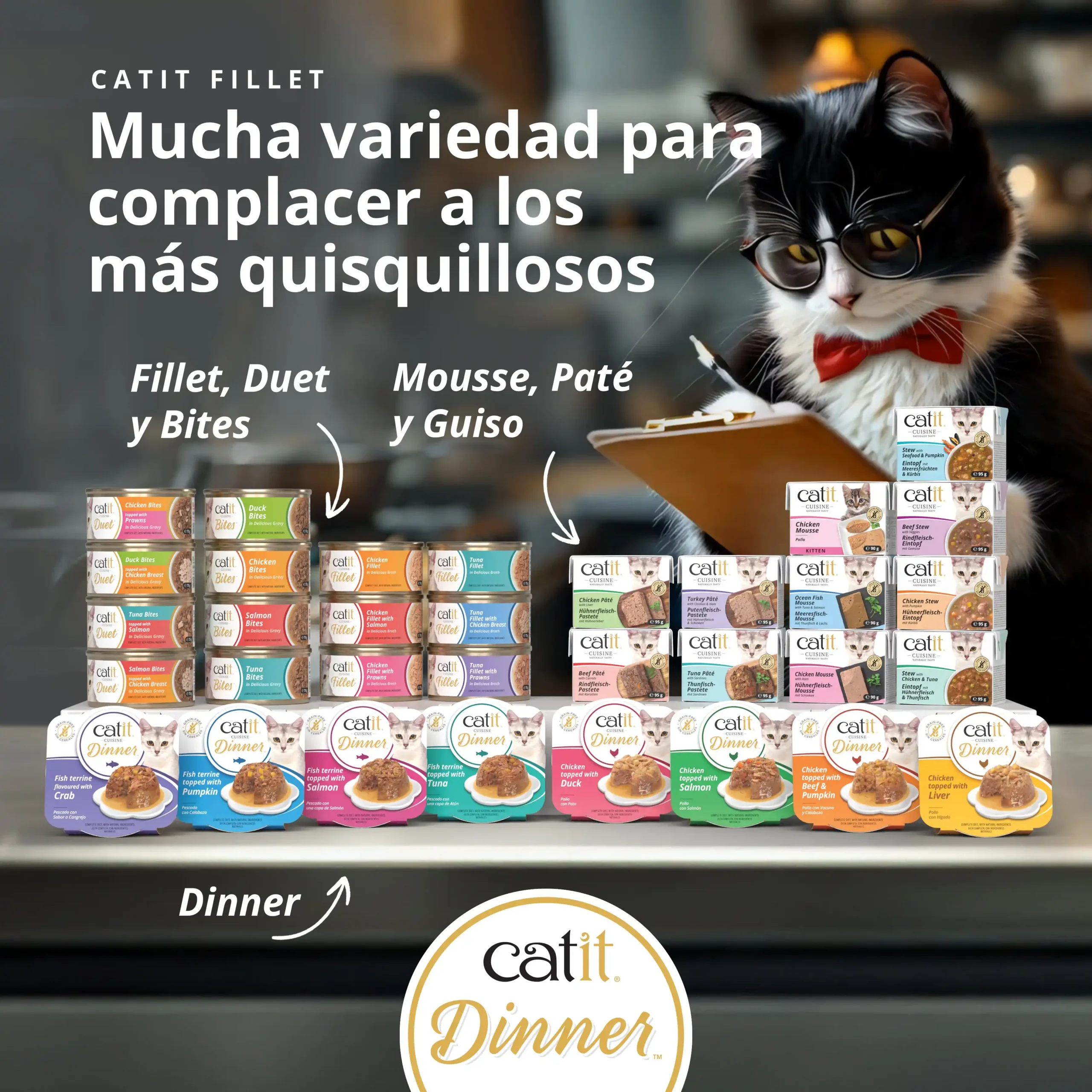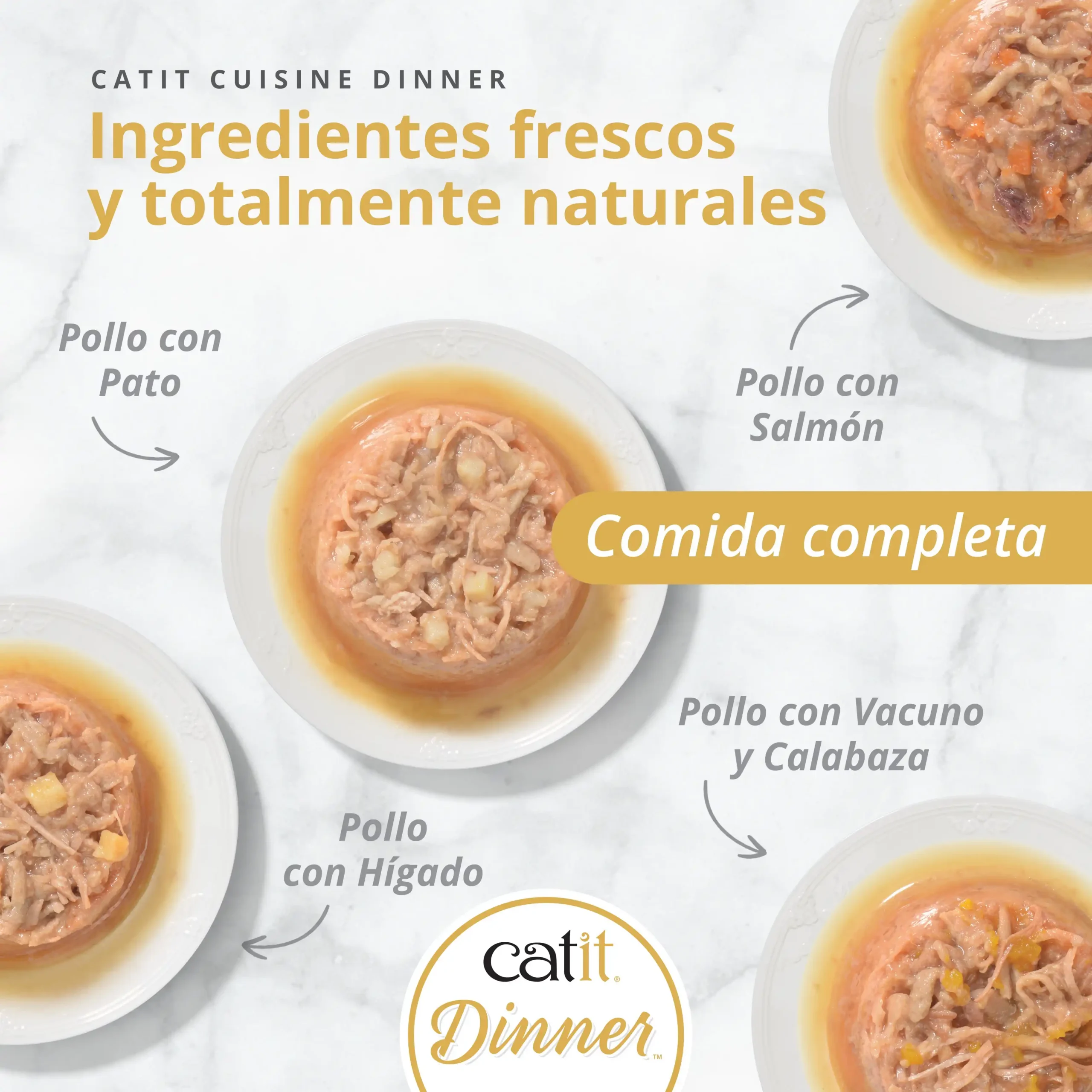 Alimento húmedo completo de doble capa a base de pollo elaborado con los mejores ingredientes frescos. — Catit Dinner es un alimento húmedo de doble capa, elaborado con ingredientes frescos y servido en una deliciosa salsa. Este alimento para gatos de primera calidad es natural, rico en proteínas y sin cereales, con vitaminas y minerales añadidos para una nutrición perfectamente equilibrada. Tan saludable como si fuera casero, Catit Dinner de Pollo ha sido cuidadosamente equilibrado para crear el complemento hidratante ideal para la dieta diaria de pienso de su gato. Les proporciona todo lo que necesitan para mantenerse felices y sanos.