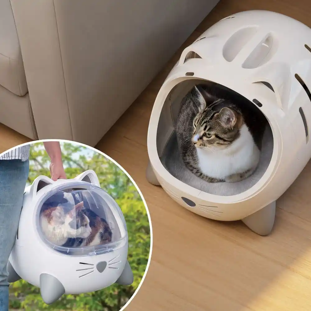 Viajar con comodidad e ir relajado en el viaje es muy importante para los gatos. Por eso el PIXI Mio es un transportín de última generación que combina una cómoda cama para gatos, con un refugio seguro, ventilado y un estilo monísimo, con forma de gato. Siguiendo la estética de toda la Serie PIXI de Catit. — Este transportín sirve como refugio en casa, con su cómoda cama y su entrada amplia. Como también ofrece la posibilidad de transportar a tu gato de forma cómoda y elegante. Los viajes con gatos suelen ser complicados, por eso este transportín PIXI Mio se ha diseñado para ofrecer un espacio seguro en casa para los gatos, que luego pueda ser el espacio que los lleva al veterinario. Se abre fácilmente y permite un acceso 360º gracias a la parte trasera extraíble. La ventana también puede sacarse y volver a colocarse cómodamente. Tiene un pestillo de seguridad y un botón de bloqueo, que evitan aperturas indeseadas. Incluye un cojín mullidito y cómodo. Lo que lo hace un transportín, refugio y cama muy versátil. Diseño PIXI con forma de gato que enamora a cualquiera. Nariz, bigotes, orejas ¡y patitas!