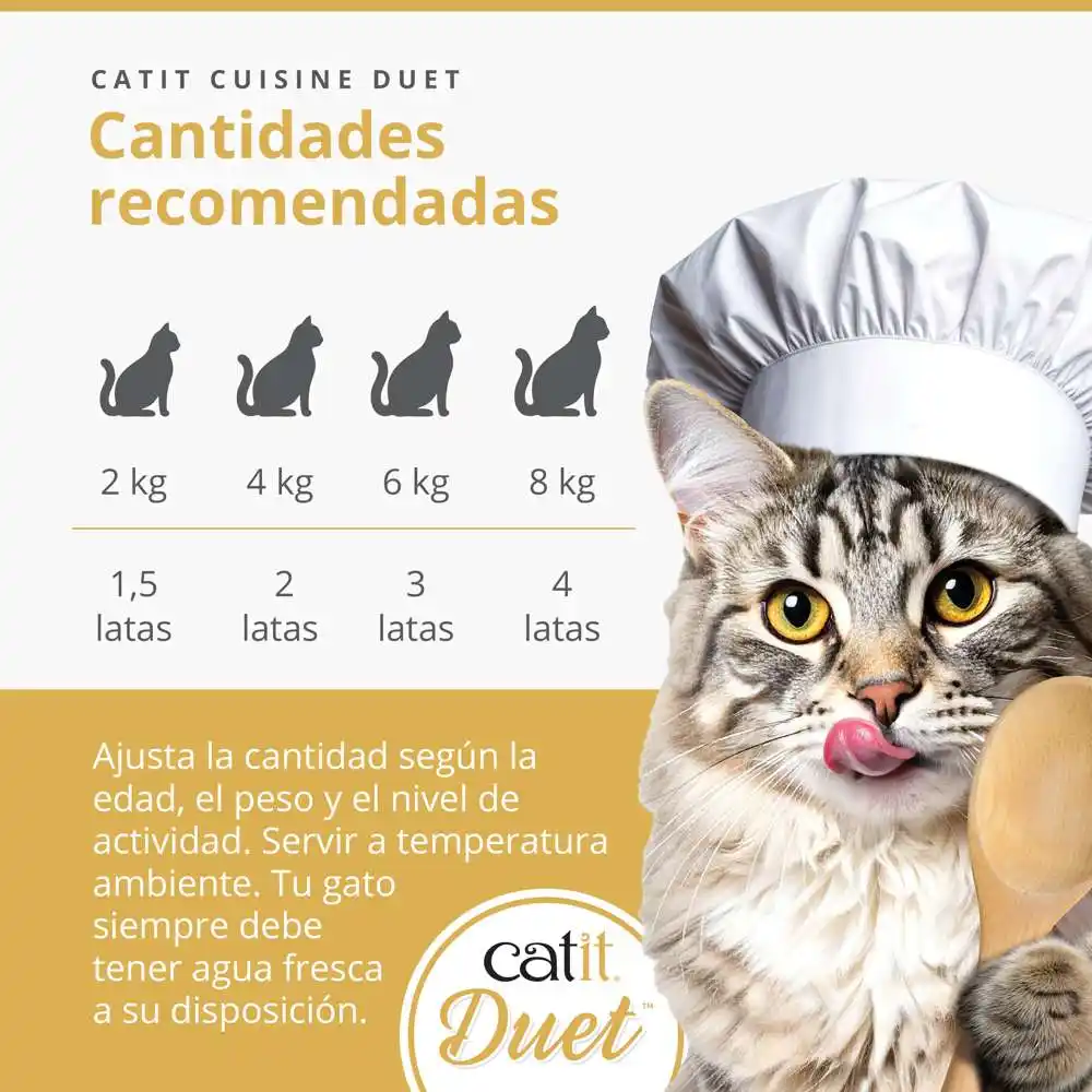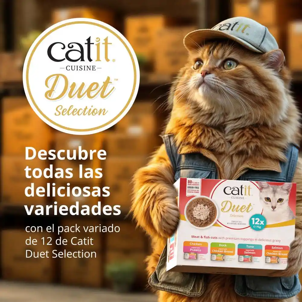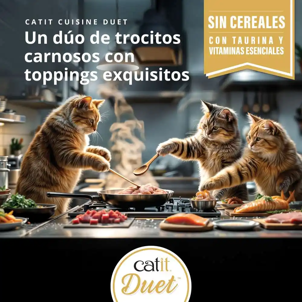 Un dúo de trocitos jugosos y deliciosos toppings. — Catit Cuisine Duet lleva la hora de la comida a un nuevo nivel con una combinación perfecta de Catit Bites cubiertos con carne o marisco de primera calidad. Este festín de dos texturas está elaborado con un 80 % de ingredientes animales de primera calidad y rico en taurina y vitaminas esenciales. Sin cereales y lleno de sabor, Catit Duet es una deliciosa opción para todos los días. Con un 80 % de ingredientes animales de calidad Catit Bites con un sabroso recubrimiento de carne o marisco de calidad Salsa deliciosa y sabrosa Sin cereales Con taurina y vitaminas esenciales Apetitoso para todos los gatos gracias a sus texturas y sabores contrastados Disponible en 4 variedades