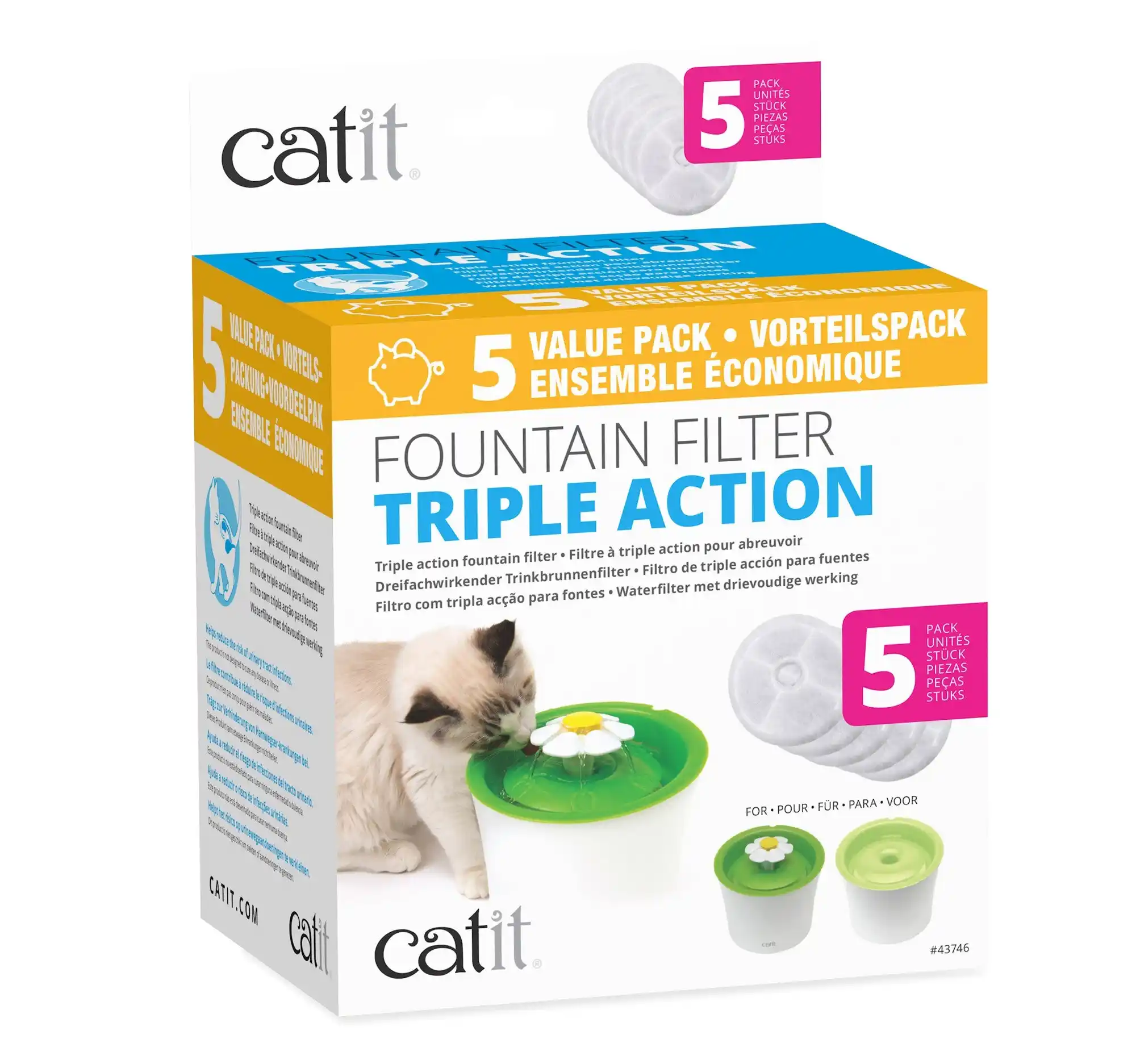 Packs de 2, 5 o 12 filtros — Eficaz filtro de agua de triple acción para las Catit Flower Fountain. Estos auténticos Filtros de Triple Acción para Fuentes Catit proporcionan filtración tres en uno para que tu gato pueda disfrutar de agua potable limpia y sin olores, directamente de su Catit Flower Fountain. • El carbón activado elimina las bacterias y los olores del cloro para mejorar el sabor del agua. • La resina de intercambio iónico ablanda el agua del grifo para ayudar a prevenir enfermedades del tracto urinario. • La malla filtra los pelos, sedimentos y residuos que haya en el agua.