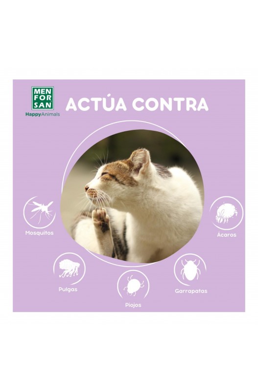 Lo que hace a MENFORSAN realmente destacar es su enfoque en la seguridad. Su fórmula natural significa que puedes usarlo con confianza incluso en gatos sensibles o en el caso de exposiciones frecuentes al exterior, sin temor a dañar la salud de tu mascota. Además, no solo proporciona una protección inmediata sino también un efecto preventivo duradero.