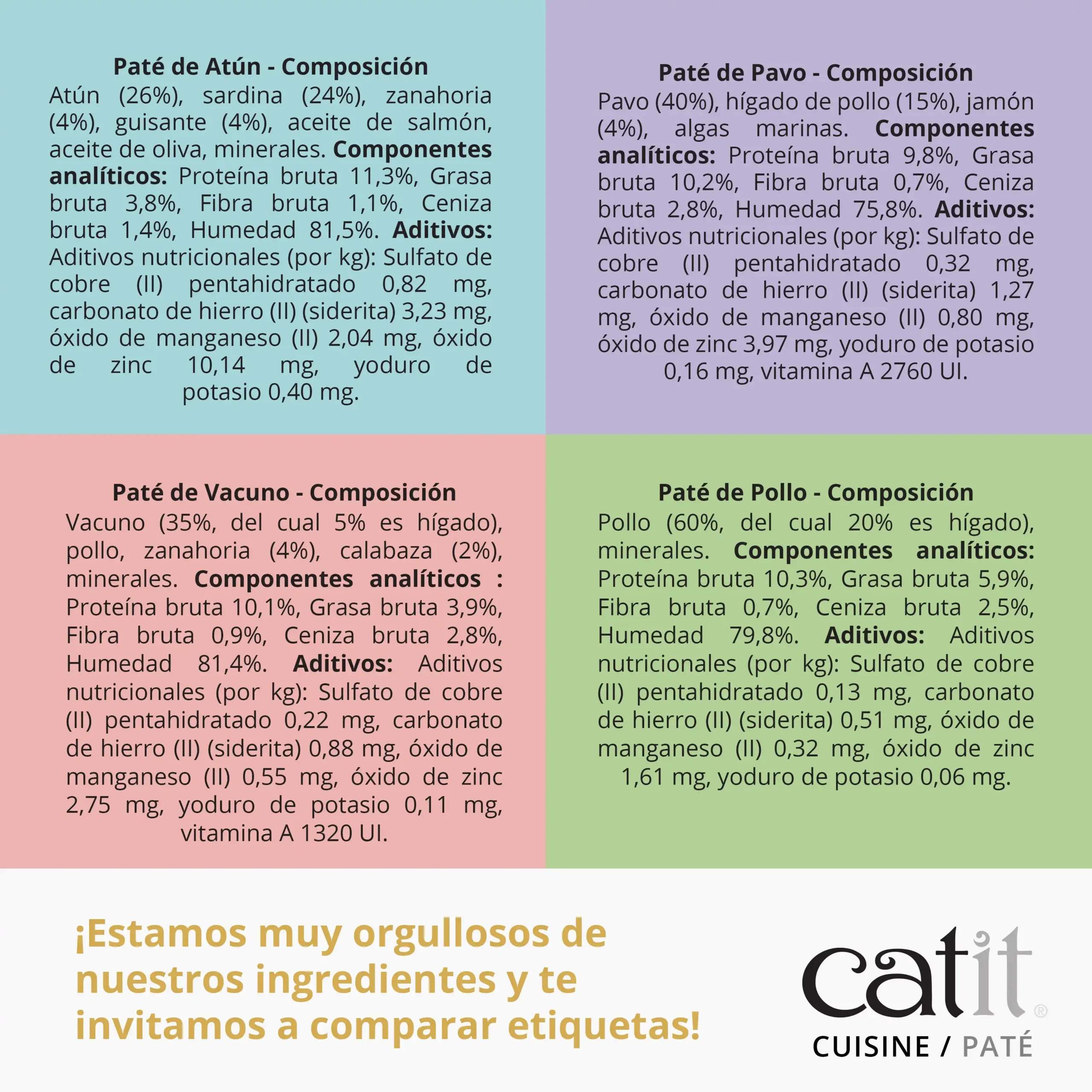 Delicioso paté para gatos completo lleno de carne y pescado de verdad — El paté Catit Cuisine es un paté suave y delicioso elaborado solo con ingredientes naturales, nutricionalmente equilibrado para mantener a tu gato con energía y vitalidad. Nuestro paté sin cereales utiliza carne real como primer ingrediente, mezclada con vegetales beneficiosos, cocinados suavemente para una máxima conservación de los nutrientes y el sabor. • Paté completo con alto contenido en carne, naturalmente rico en taurina. • Textura suave, gran sabor. • Alto contenido de agua que ayuda a mantener hidratado a tu felino. • SIN cereales, soja ni gluten. • SIN conservantes, aromatizantes ni colorantes artificiales. • SIN OMG ni azúcares añadidos. • Envase de 95 g que se puede volver a cerrar. • Disponible en cuatro deliciosas variedades. • Fabricados con un 70% de cartón renovable con certificación FSC • Envases Tetra Pack reciclables cuya producción consume menos energía que la de otros tipos de envases. • Disponible en textura Mousse y Guiso .