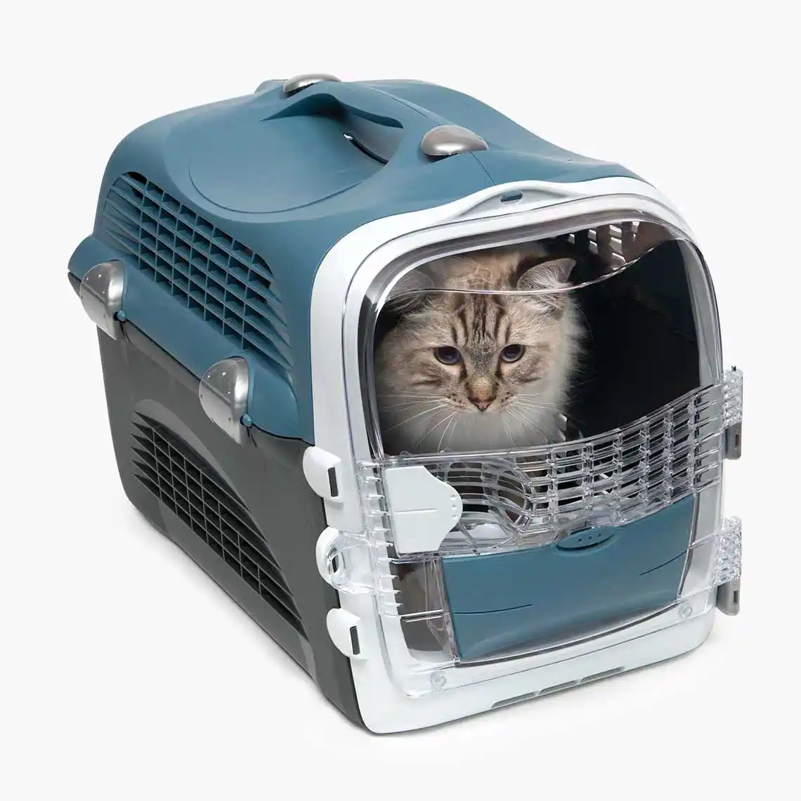 Transportín para gatos multi-funcional — El Catit Cabrio es un transportín es ideal para gatos a los que no les gusta viajar. Además del transporín se abre convenientemente desde la parte frontal y superior para que tu gato se sienta menos acorralado y un sistema seguro de bloqueo con una sola mano hace que meter y mantener a tu gato dentro sea muy fácil. El flujo de aire y la ventilación óptimas mantienen a tu gato cómodo mientras viaja. • Diseño accesible 360° con mecanismo de bloqueo de una sola mano. • Muchas características prácticas para un viaje seguro. • Disponible en Azul Grisáceo, Turquesa y Rojo Cereza. • Para gatos de una altura máxima de 35 cm y un peso máximo de 11,3 kg. • Dimensiones: 51 x 33 x 35 cm (Profundidad x Anchura x Altura).